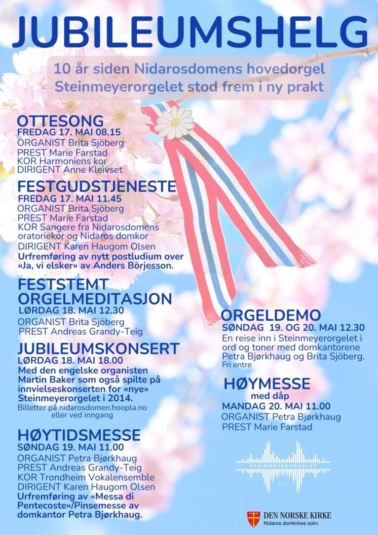 I pinsehelgen feirer vi at det er 10 år siden at kirkens hovedorgel, Steinmeyerorgelet, stod ferdig restaurert. Alle er hjertelig velkommen til å ta del i feiringen. Program: