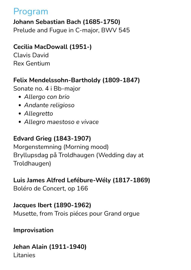 Petra Bjørkhaug has been Cathedral organist at Nidaros Cathedral since 2007. She has studied piano, organ, singing and composition, and is educated as a pedagog and organist at Trøndelag Music Conservatory (NTNU). She holds from 2017 a master's degree in organ improvisation from the Norwegian Academy of Music.