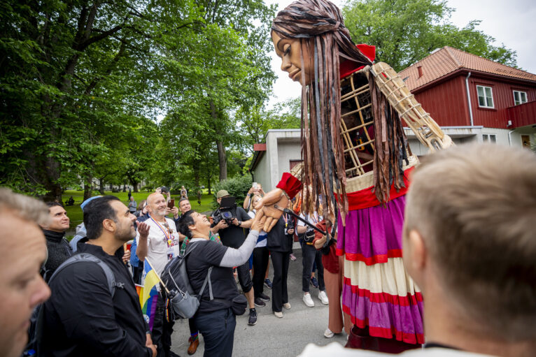 The final leg of the journey went from Lian in Trondheim down to Nidaros Cathedral. On the way down, Seyran was accompanied by around 1000 attendees of all ages, and together, they walked the last 5 km to Nidaros Cathedral. Here, they were greeted by the puppet "Little Amal," part of an international art project about a Syrian girl searching for a safe place to sleep.