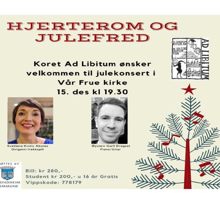 Velkommen til konserten "Hjerterom og julefred"!Vi håper å synge julefreden inn i publikums hjerter denne kvelden.Repertoaret er variert, det blir gamle juleklassikere, men også noen nye julegodbiter. Mest rolig og nært, men også litt mer poppet.Nytt av året, synger vi vekselsvis som dame- og herrekor på enkelte sanger.Vi har helt ny og dyktig dirigent: Svetlana Krstic Aksnes. Hun vil også akkompagnere oss på trekkspill.I tillegg har vi med oss Øystein Garli Dragset på gitar og piano.