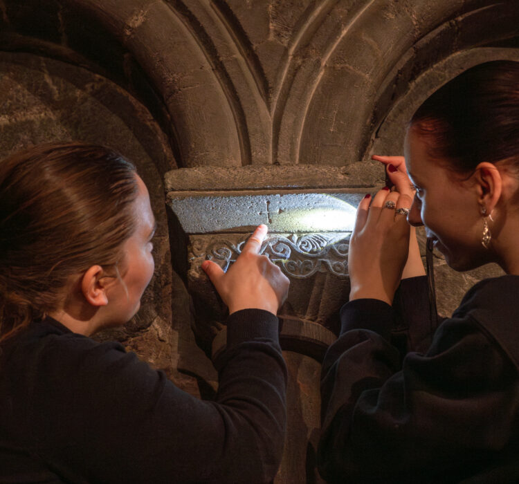 Bli med arkeolog Kjersti Kristoffersen på en oppdagelsesferd i katedralen, hvor vi finner spor etter fem steinhuggerne som deltok i byggingen av katedralen på 1100-tallet.