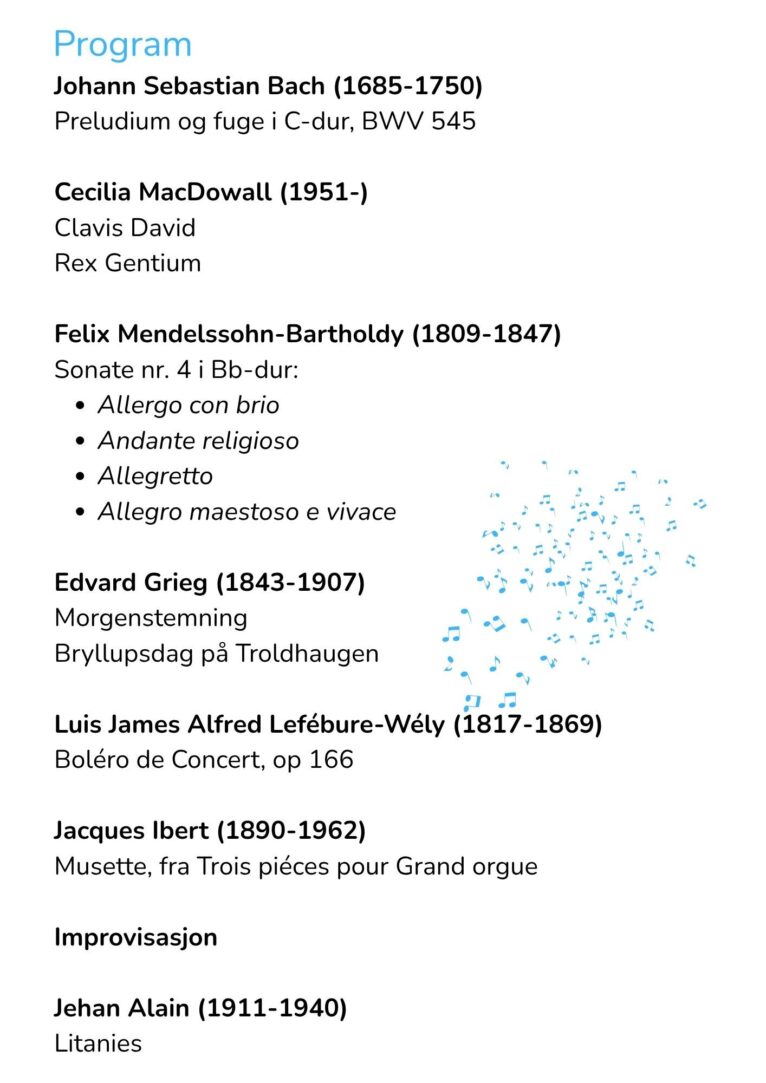 Petra Bjørkhaug has been Cathedral organist at Nidaros Cathedral since 2007. She has studied piano, organ, singing and composition, and is educated as a pedagog and organist at Trøndelag Music Conservatory (NTNU). She holds from 2017 a master's degree in organ improvisation from the Norwegian Academy of Music.