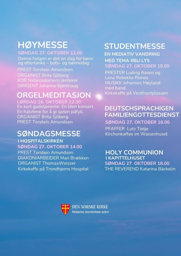 Kveldsmesse med musikk, tekstmeditasjon, bønnevandringer med symbolhandlinger og nattverd - og med mulighet for forbønn. Tema for messen er #bli lys. Messen ledes av studentprestene Ludvig Aasen og Lena Rebekka Risnes. Musikk ved Johannes Høyland på piano og orgel, samt studenter ved Institutt for musikk, NTNU.