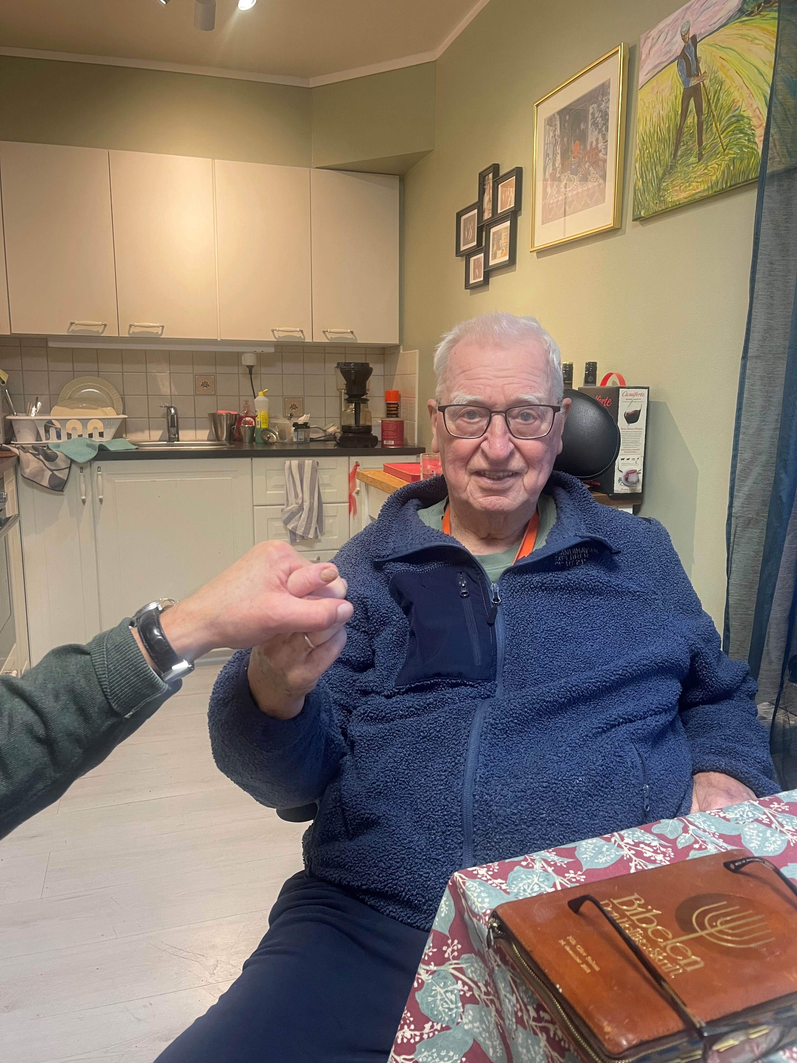 Men nå er det fredag. Han gleder seg til å besøke Nils Olav. På veien er han innom bakeriet og kjøper med lukket valnøtt til kaffen.