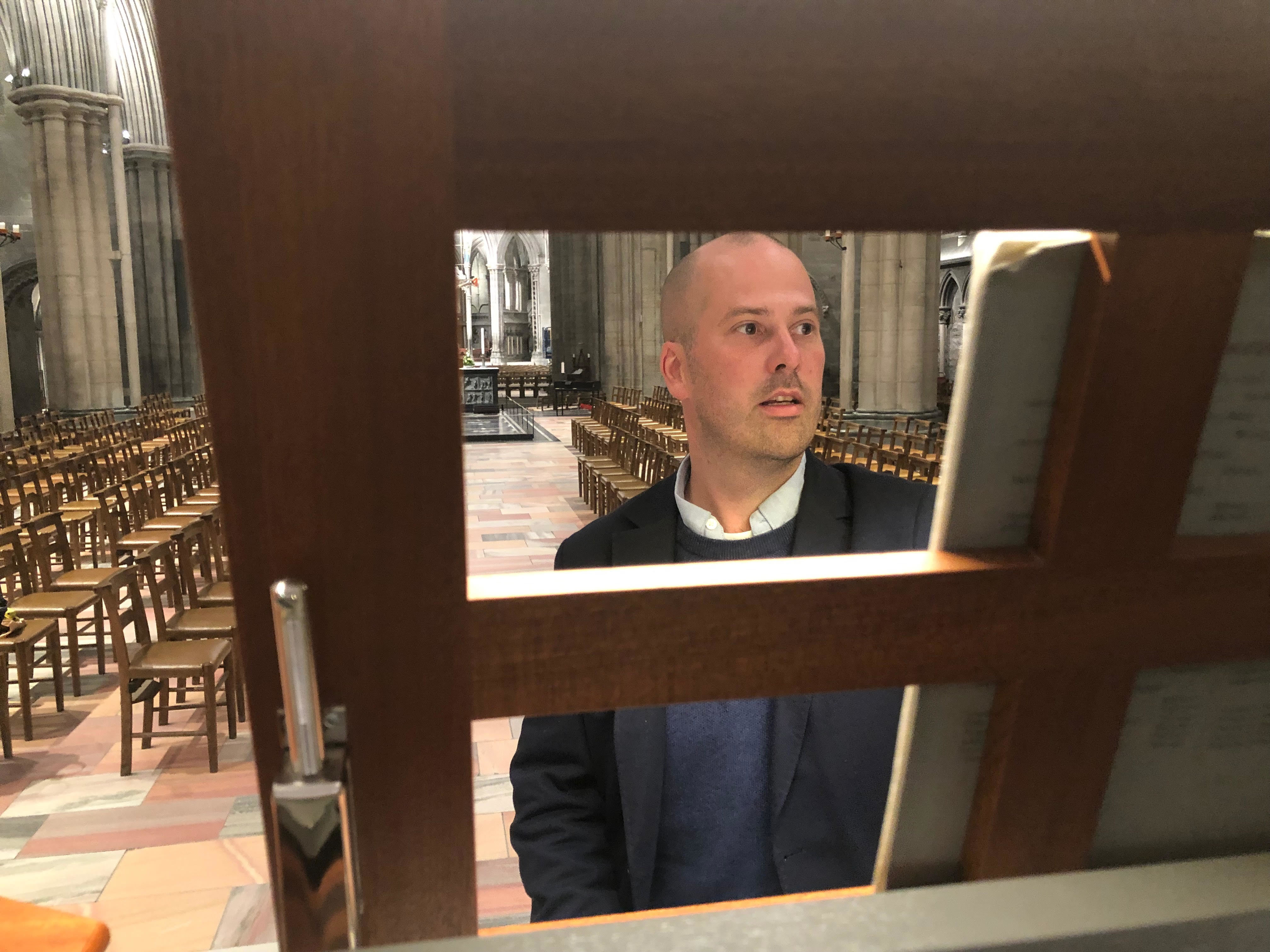 På Steinmeyerorgelet kan organisten spille inn det han øver på, for så vandre rundt i Nidarosdomen og høre på hvordan det ble. Her lytter Espen Melbø til sin egen innspilling.