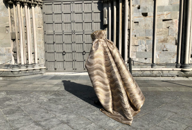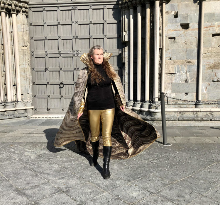 Vi møter Holmberg utenfor Nidarosdomen. Hun bærer en kappe inspirert av orgelinstrumentet, sydd av kostymedesigner Dagmar Elizabeth Mecca for anledningen. I de siste ti årene har hun arbeidet med kunstnerisk utforskning av kirkerommet. Hun har blant annet undersøkt kirkens potensial som kunstarena og forbindelseslinjene mellom religion og estetikk.