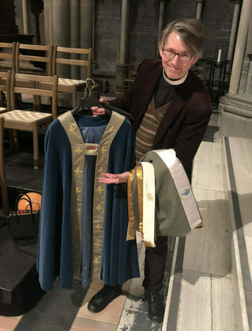 Karon Wanvik har designet barnebiskop-kappen vi har i Nidarosdomen. Her vist frem av sokneprest Andreas Grandy-Teig. (Foto: Karina Lein)