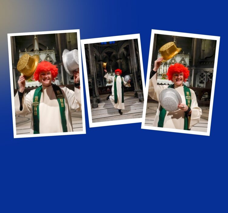En gull-glitrende hatt har kommet til syne i prestens hånd, og med en elegant bevegelse plasserer hun den på sin knallrøde parykk.
