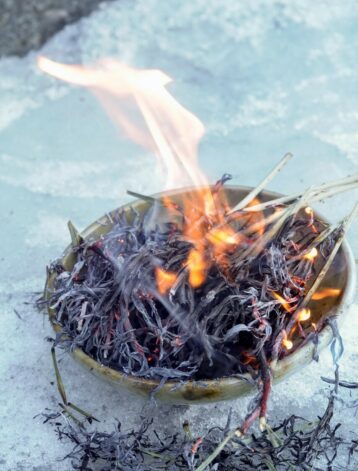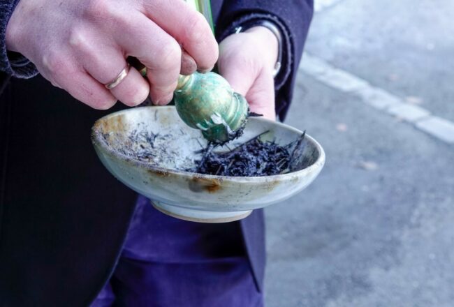 Trygt utendørs tar de raskt fyr. Med en morter og litt olje er palmegreinene forvandlet til aske, og klar til å bli brukt i kirkens rituale under gudstjenesten 2. mars.