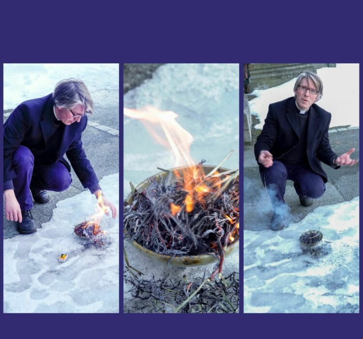 Tørkede palmeblader blir til aske. Sokneprest Andreas Grandy-Teig.
