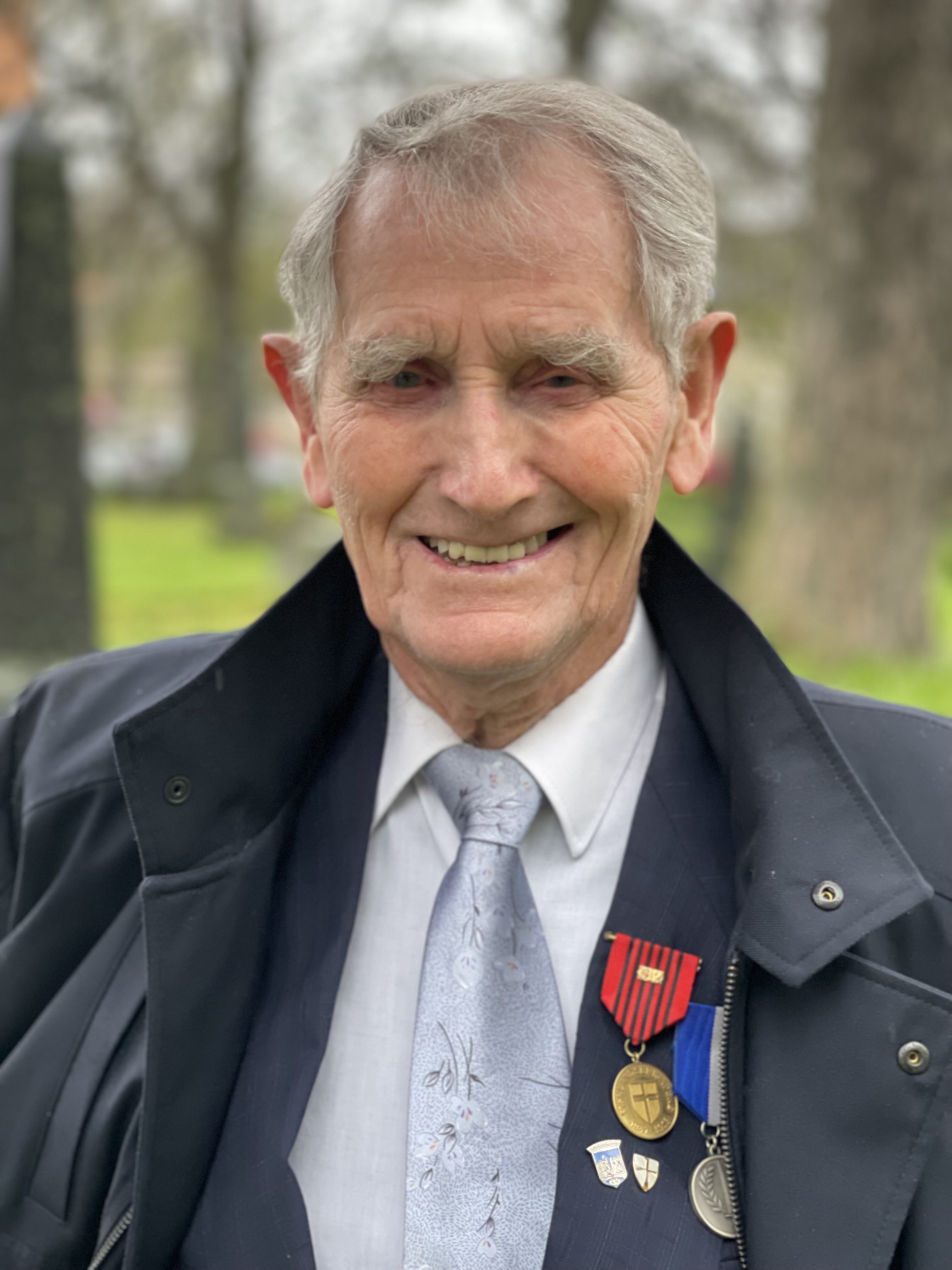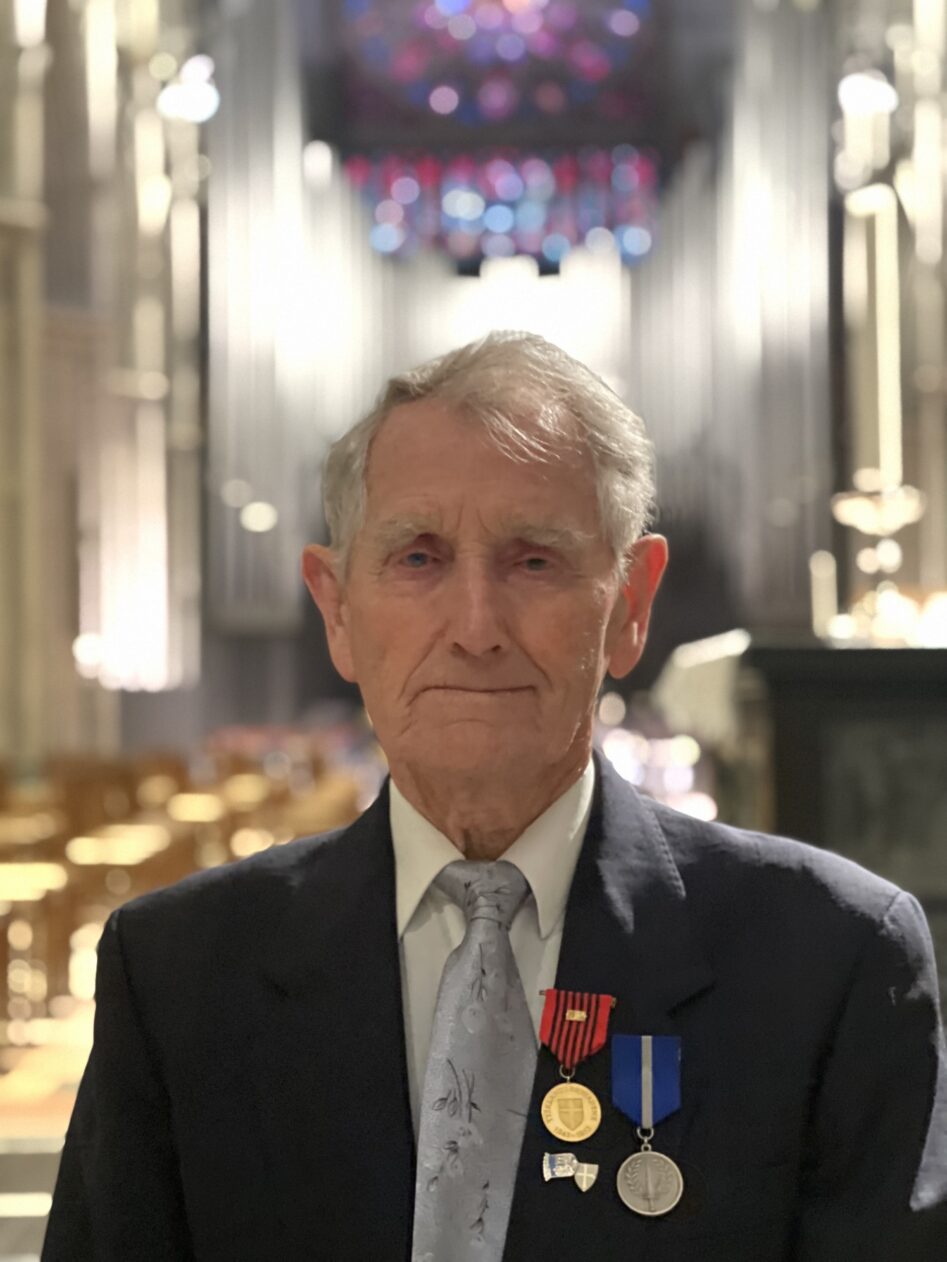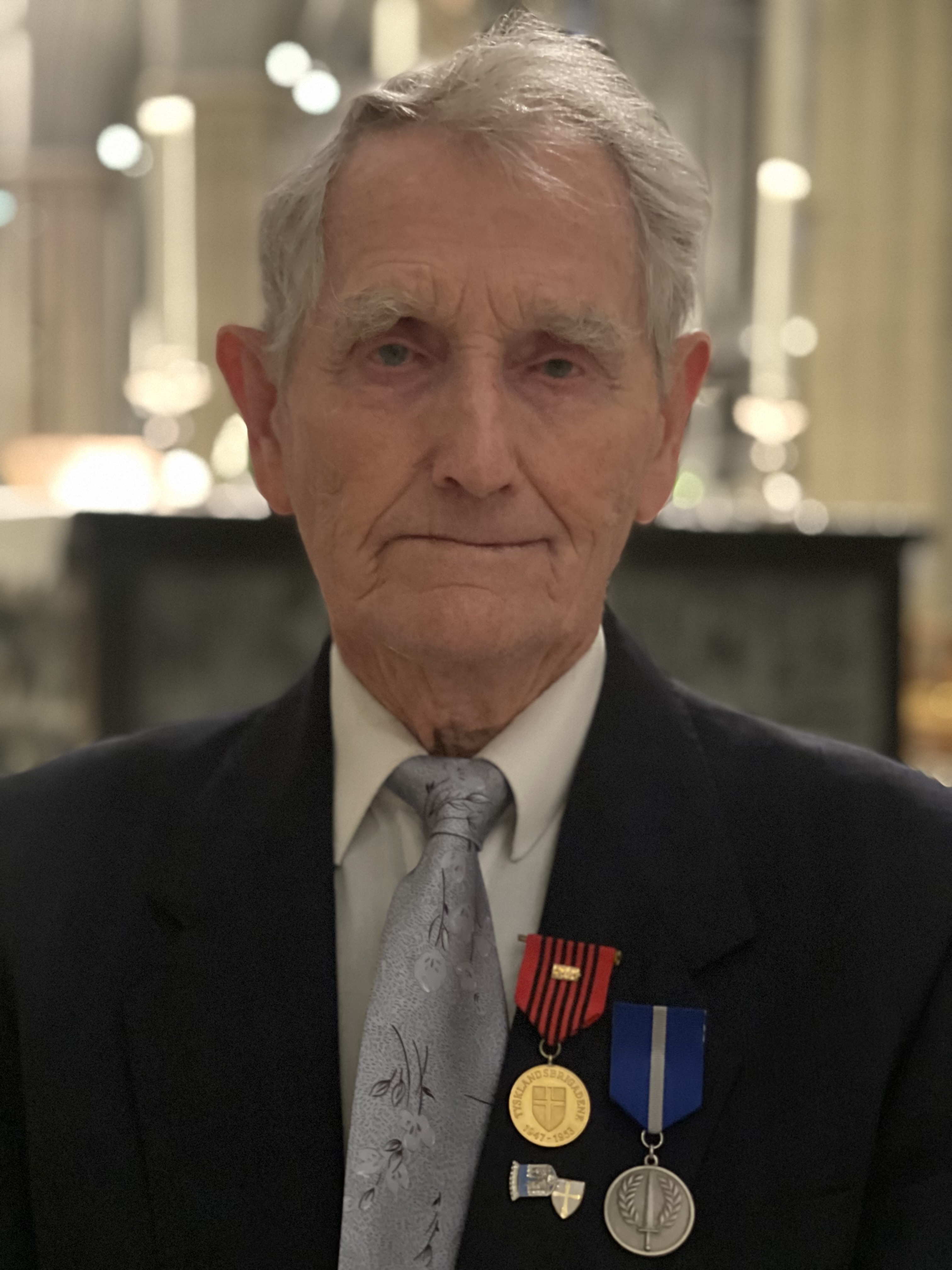 På brystet henger medaljen som takk for tjenesten han utførte for fedrelandet i årene etter krigen, samt Forsvarets medalje. Han bærer sine medaljer med stolthet. Medaljen for sin innsats i Tysklandsbrigaden fikk han for om lag ti år siden.