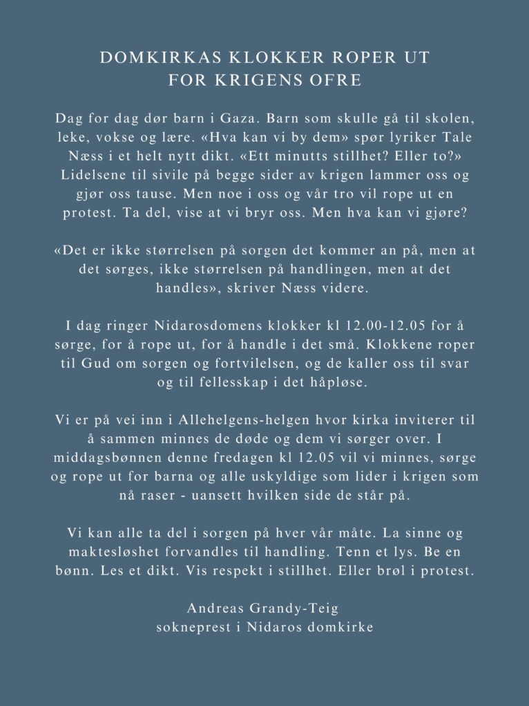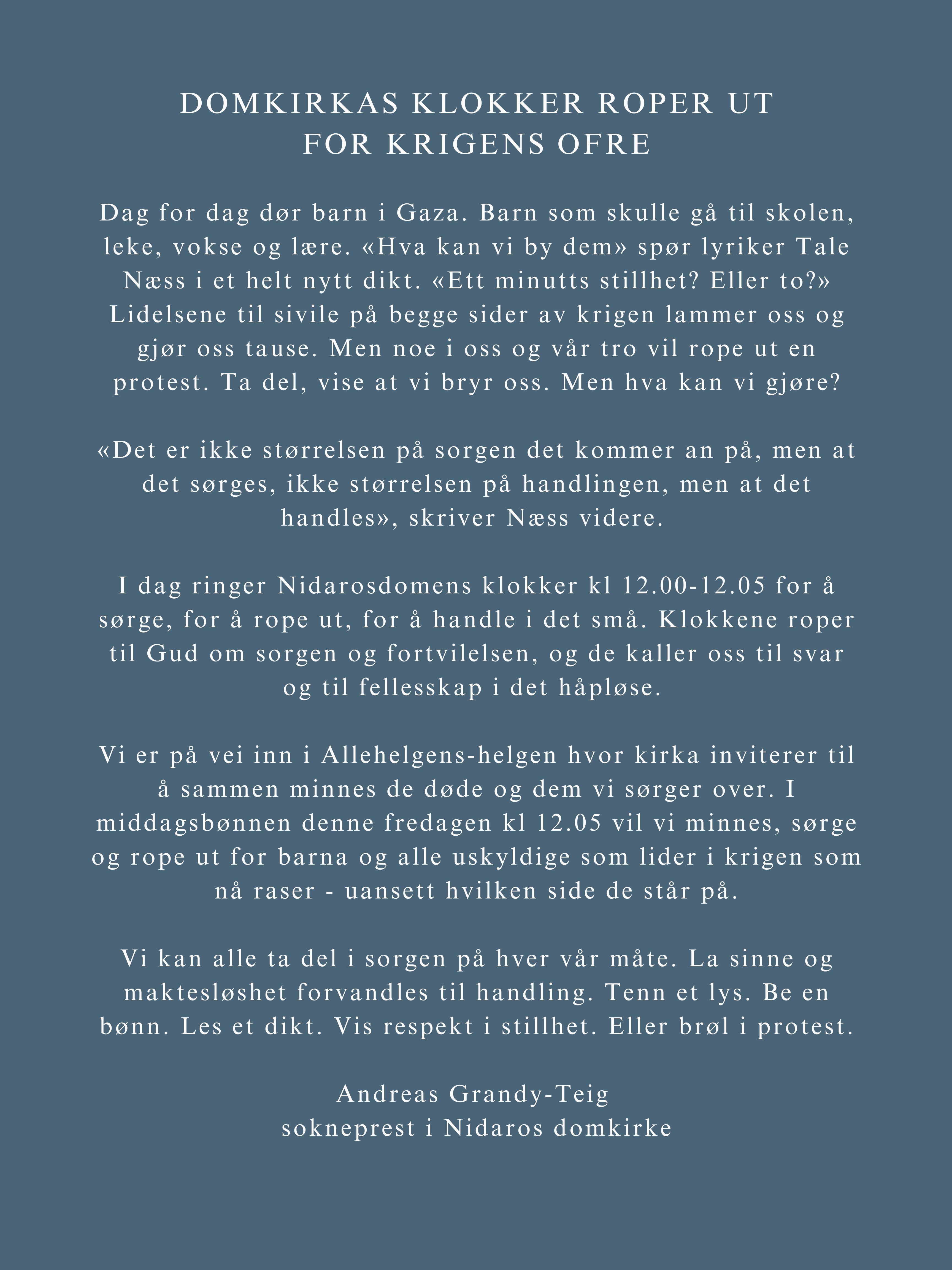 Foto: Karina LeinDomkirkas klokker roper ut for krigens ofre Fredag 3. november kl. 12.00 roper Nidaros domkirkes klokker ut for krigens ofre i Gaza.