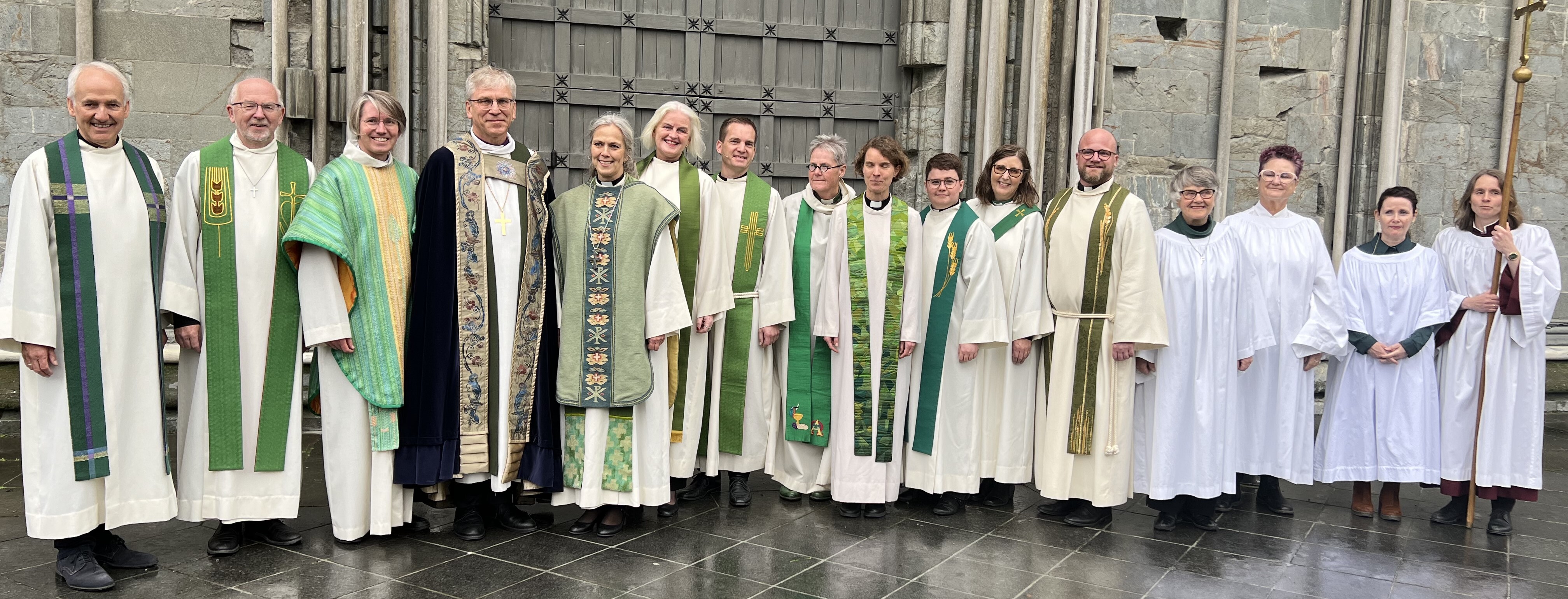 Deltok i høymessen. Fra venstre Øyvind Heggland (vikarprest i Nidarosdomen ), Stein Ellinggard (sokneprest Bakklandet, Lademoen), Andreas Grandy-Teig (sokneprest Nidarosdomen), preses Olav Fykse Tveit, domprost Kristin Moen Saxegaard, Marie Farstad ( kapellan Nidarosdomen), Ludvig Aasen (studentprest), Sheila Rosenthal (anglikansk prest) , Angelika Grandy-Teig sokneprest Lade, Kristina Bjårstad (kapellan Bakklandet, Lademoen, Lade), Sissel Smørvik (diakon Bakklandet, Lademoen), Steffen Torsteinsen Aune ( prest Bakklandet, Lademoen, Aase Laila (medliturg), Grethe Hagen (medliturg), Tone Gjævran (medliturg) og Ina Myrvang (klokker). (Foto: Tone Gullaksen/Den norske kirke Nidaros)