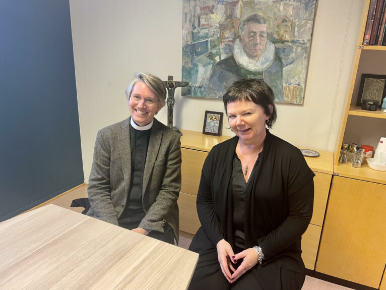 Ragnhild Jepsen på kontoret sammen med Andreas Grandy-Teig. Han vil nå fungere som domprost til en ny er ansatt.