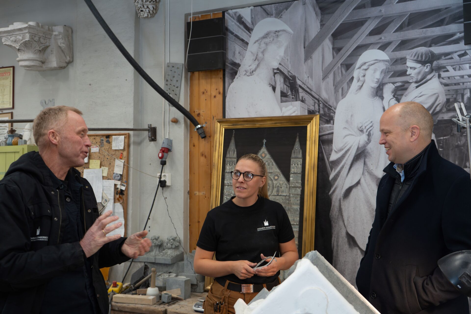Tirsdag fikk han og andre senterpolitikere oppleve kirkebevaring i praksis i møte med murere og gipsmakere på stillaset på Nidarosdomens sørgavl.